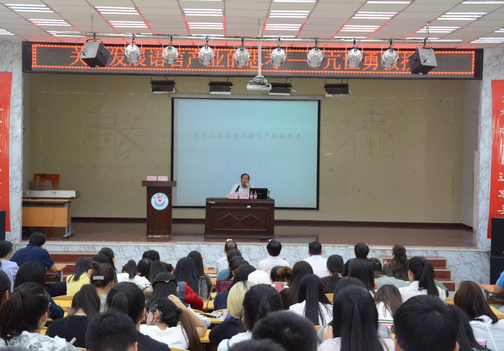 报告会伊始,亢世勇教授分享了当时在校学习及工作的经历,他说自己34年前怀揣着梦想来到学校,感谢在校学习的那段艰苦生活锤生了自己日后艰苦拼搏的自觉,给予了自己源源不断的艰苦奋斗的动力。报告会上,亢世勇教授围绕“语言产业发展”这一主题,发展趋势、国内对语言产业的认识、语言产业的业态等方面展开论述。他结合我国语言产业发展的现状分析了国内对语言产业的认识,用图表及数据说明了语言产业发展的大致形态,并依托教师、律师、医生等职业分析了当前语言产业的业态。最后,他对山东省发展语言产业的必要性和可行性进行了分析。报告会结束前,亢世勇教授与在场学生展开了互动,并热情认真地回答了学生所提的问题。
