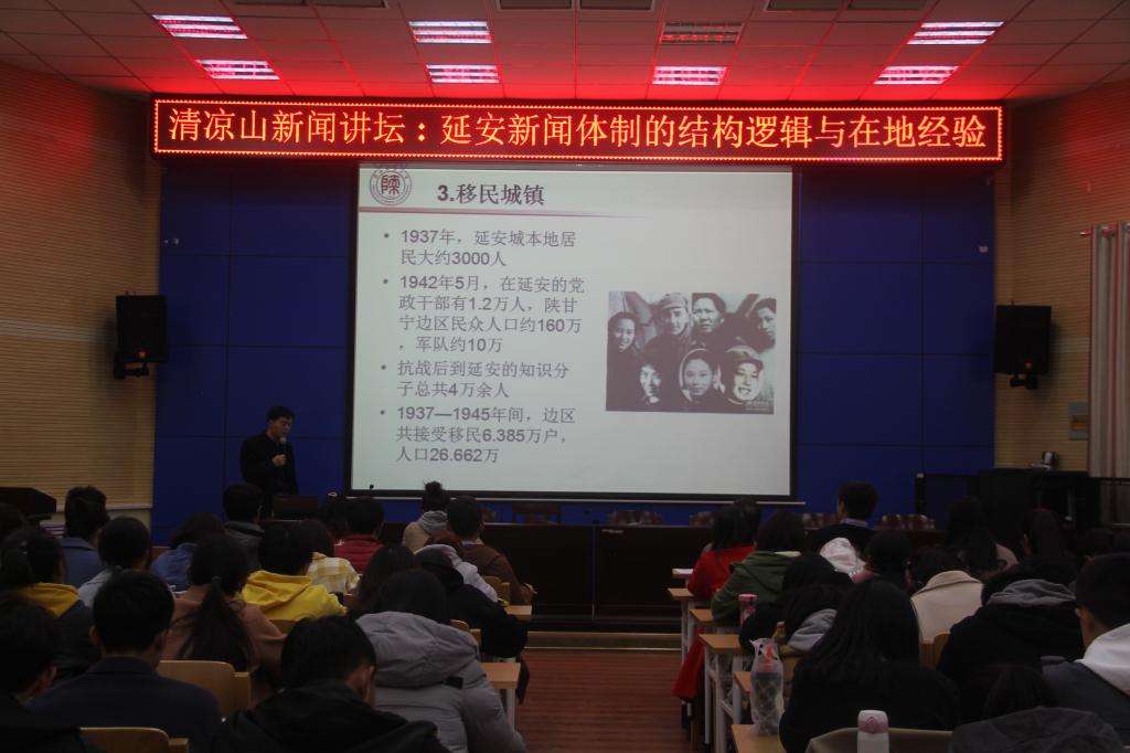 报告中,许加彪教授以自己在延安寻“根”的亲身经历为开端,分别从历史的不同阶段为大家详细阐述了“万众瞩目清凉山”、延安道路和延安精神、马克思主义新闻观中国化等问题。同时,他也为同学们分享了自己对《解放日报》的改版及其历史地位和办报方法的研究心得。