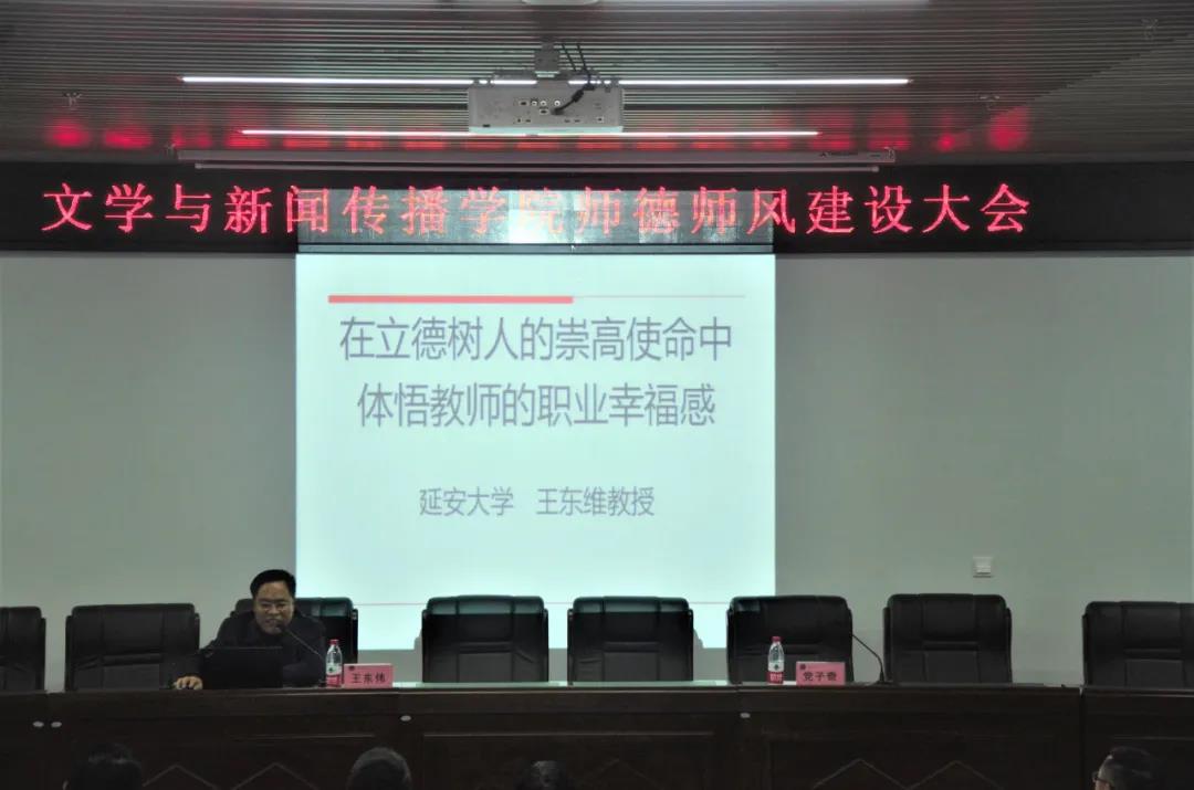 (本网讯)为贯彻落实中省校有关师德师风建设的要求,进一步提升教师的思想道德修养和职业荣誉感。12月3日下午,文学与新闻传播学院邀请马克思主义学院教授王东维在学院201报告厅作了师德师风建设专题报告。学院党政领导、全体教师和学生代表100余人聆听了报告。报告会由学院党委书记党子奇主持。