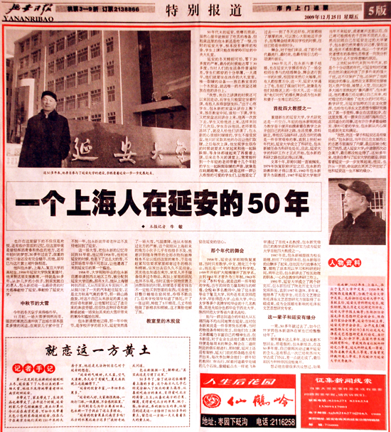 编者按: 2009年12月25日,《延安日报》在“特别报道”版发表了记者牛敏采写的通讯《一个上海人在延安的五十年》,报道了我院文艺学学科带头人教授包永新把人生的大半辈子奉献给延安大学的经历与执着精神。《延安日报》同时为这篇通讯配发了“记者手记”“人物资料”和相关图片。