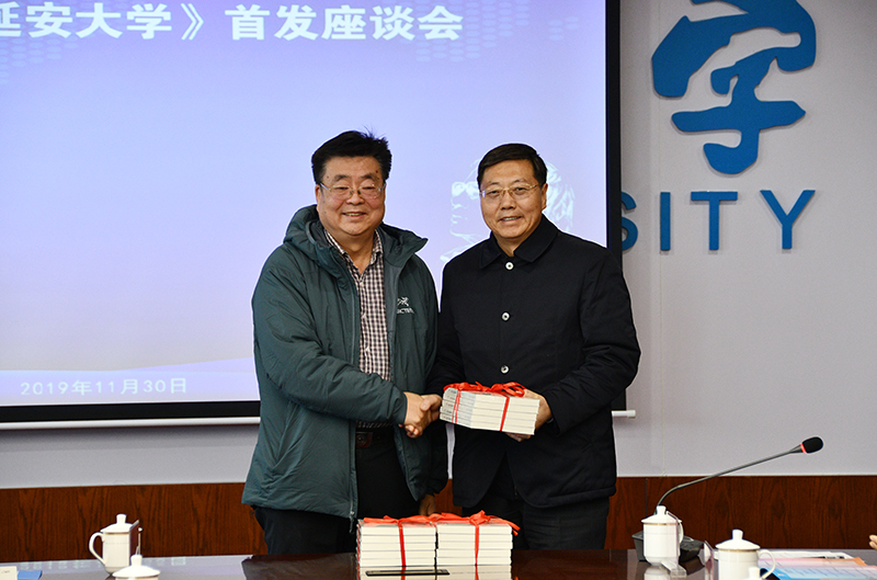 2019年11月30日,梁相斌社长代表新华出版社向我校赠送图书《路遥与延安大学》,张金锁校长代表我校接受图书。