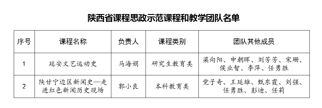 (本网讯)近日,陕西教育厅公布了2021普通高等教育和高等继续教育省级课程思政示范课程、教学团队、教学研究师范中心认定结果的通知。我院马海娟教授负责的《延安文艺运动史》(研究生教育类)、郭小良副教授负责的《陕甘宁边区新闻史——走进红色新闻历史现场》(本科教育类)被认定为省级课程思政示范课以及教学团队。