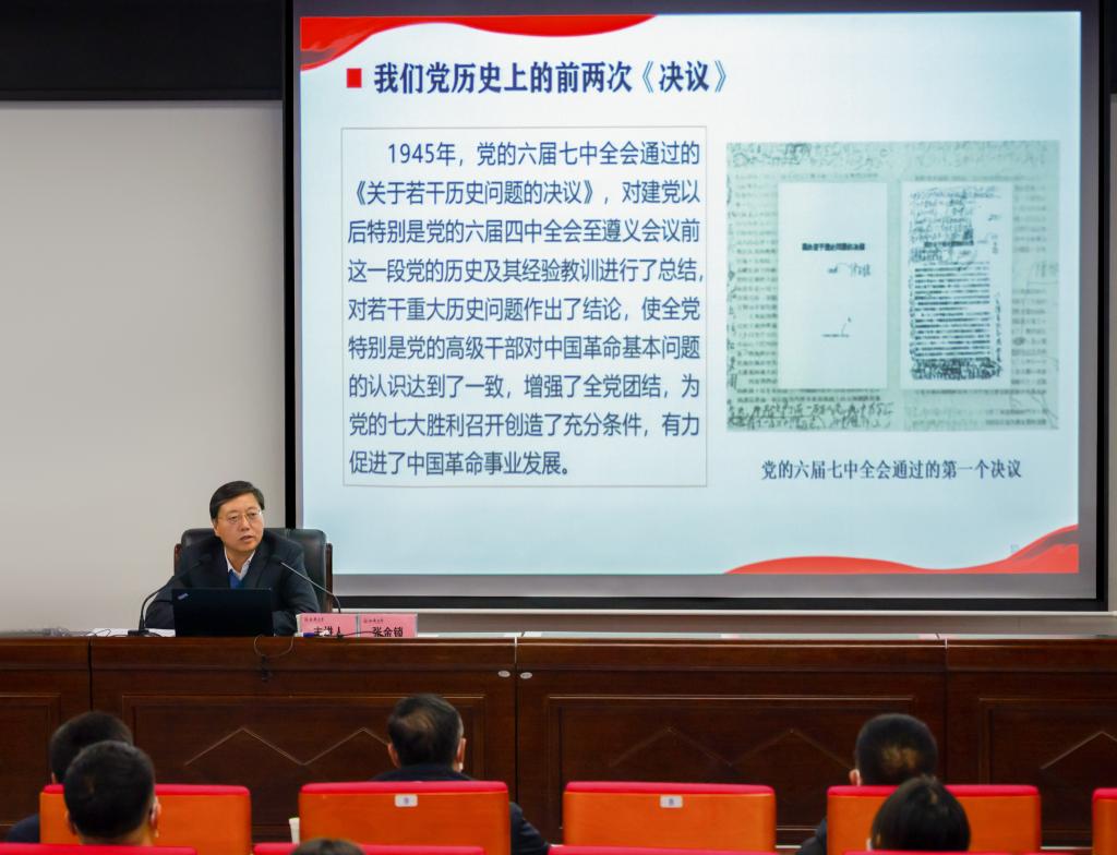张金锁主要从深刻理解党的十九届六中全会精神、客观分析我校“十三五”发展成就与问题、奋力谱写更有特色更有水平大学建设新篇章三个方面进行宣讲。张金锁强调,审议通过的《决议》是一篇马克思主义的纲领性文献,是新时代中国共产党人牢记初心使命、坚持和发展中国特色社会主义的政治宣言,是以史为鉴、开创未来,实现中华民族伟大复兴的行动指南。我们要深刻认识总结党的百年奋斗重大成就和历史经验的重大意义,深刻认识党的百年奋斗的初心使命,深刻认识中国特色社会主义新时代的历史成就和历史性变革,深刻认识党的百年奋斗的历史经验,深刻认识以史为鉴、开创未来的重要要求,从党的百年奋斗历程中汲取智慧和力量。回顾党的百年征程,我们党总是善于从历史的峥嵘岁月、风雨历程中不断总结经验、勇于自我革命。希望老师和同学们要认真学习党的十九届六中全会精神,坚定理想信念,勇于担当和自我革命,将党的十九届六中全会精神学深学精,融会贯通,指导自己的工作和学习实践。