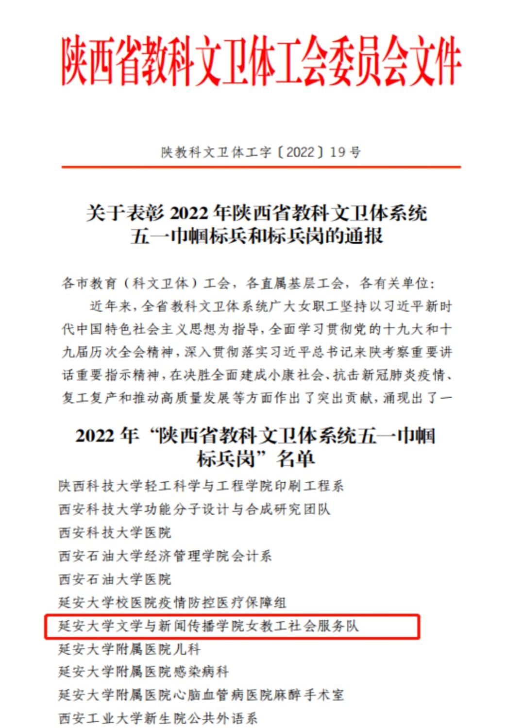 (本网讯)近日,陕西省教科文卫体工会委员会授予我院女教工社会服务队“陕西省教科文卫体系统五一巾帼标兵岗”称号。