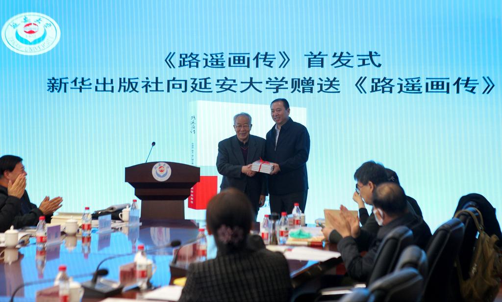 在《路遥画传》首发式上,延安大学党委原书记、原校长、路遥研究会会长、《路遥画传》作者之一申沛昌,代表新华出版社向延安大学赠送了《路遥画传》,高子伟校长代表延安大学接受了赠书。