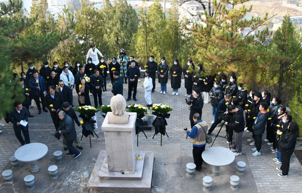 上午,参加线下会议的代表们首先登山来到位于我校文汇山半山腰的路遥墓园,向路遥墓敬献花篮、鲜花并表达了对路遥的哀思。随后,代表们乘车来到延安大学新校区,在行政楼二楼会议室举行了路遥逝世30周年纪念大会暨《路遥画传》首发式。