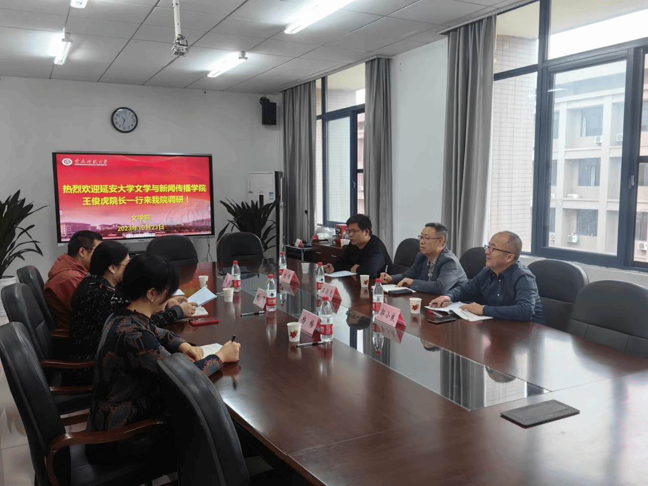 在西南政法大学新闻传播学院,王俊虎一行与西南政法大学新闻传播学院副院长蔡斐、张治中以及网络与新媒体系主任任正安、新闻传播学院副教授刘大明等座谈交流,重点考察了解该院网络与新媒体专业的课程设置与学生就业流向、新闻传播学一级学科学位授权点的申报与建设、延安时期红色新闻资源的挖掘与建设等,并在副院长蔡斐等陪同下实地参观考察了西南政法大学新闻传播学院融媒体实验室、资料室、文化墙、教职工休闲茶室等。双方表示,将进一步加强两院在融媒体实验室建设、延安时期红色新闻资源的开发与利用、新闻学人才培养等方面加强交流,共同推动新闻学学科创新发展。